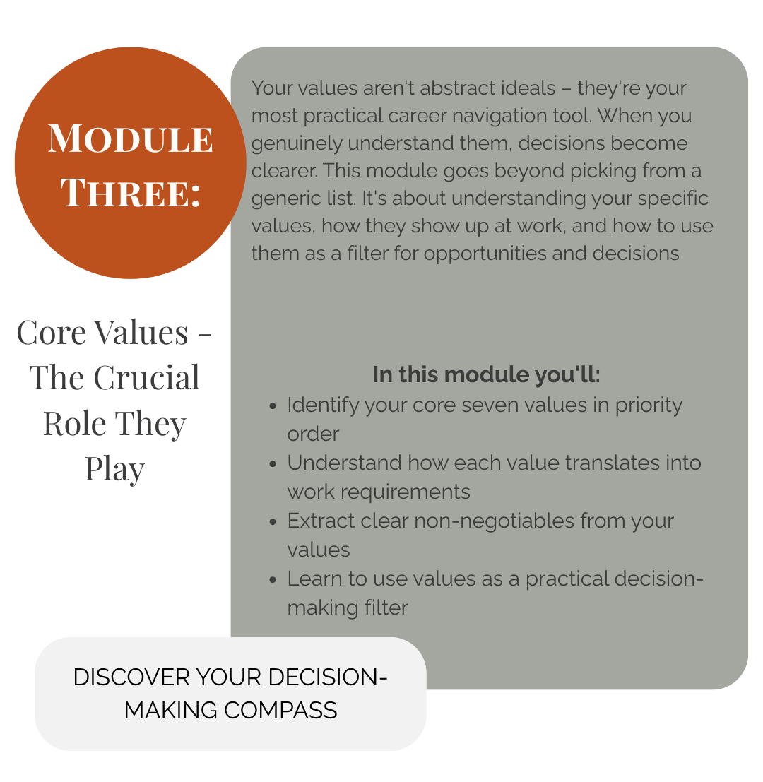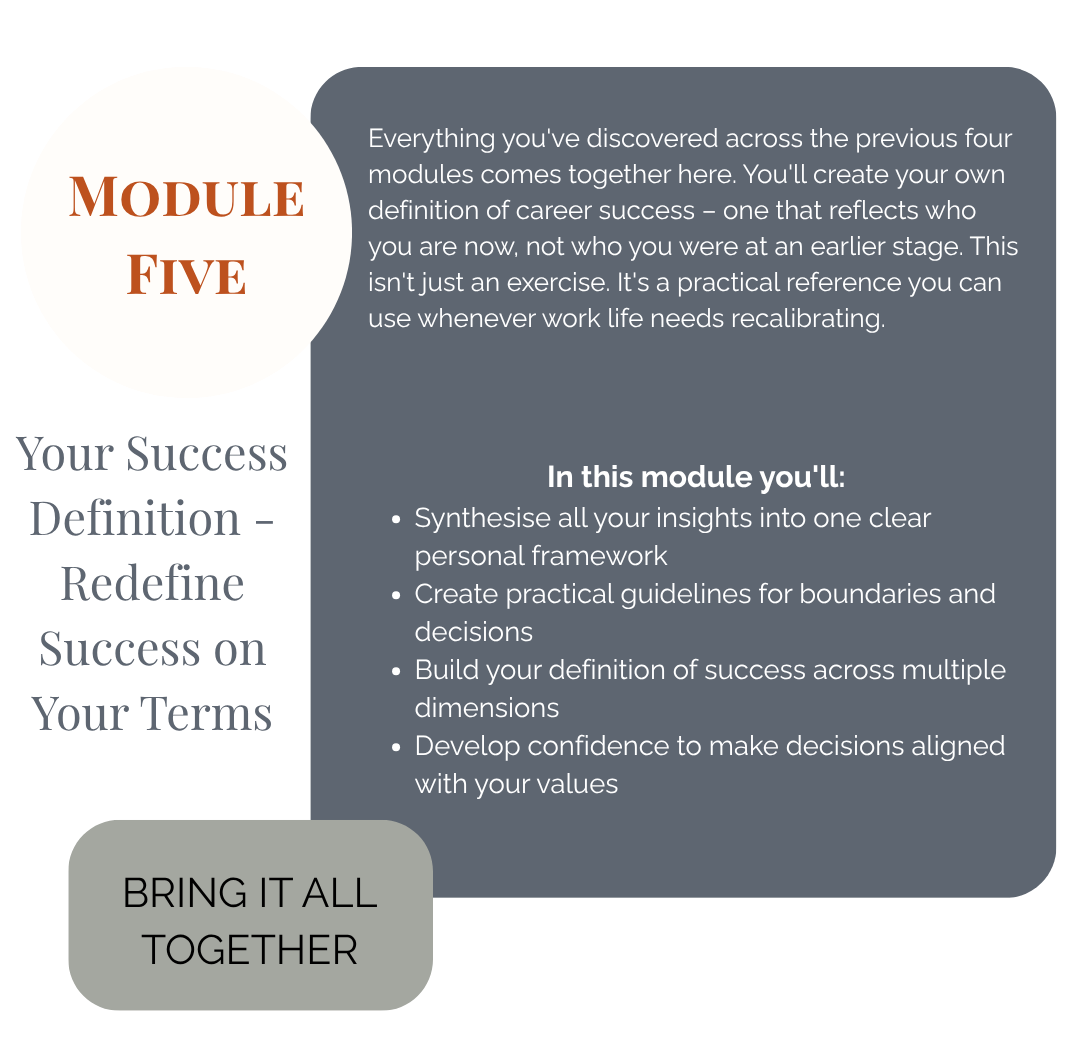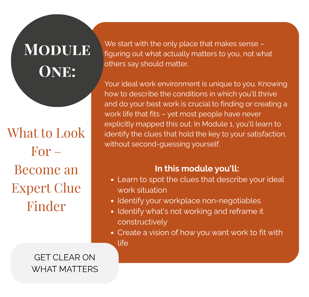 Each module in The Career Refresh contains short videos and exercises specifically created to move you forward in your understanding - from gaining initial clues about what matters to you, through identifying what's been holding you back, to creating your own definition of career success.