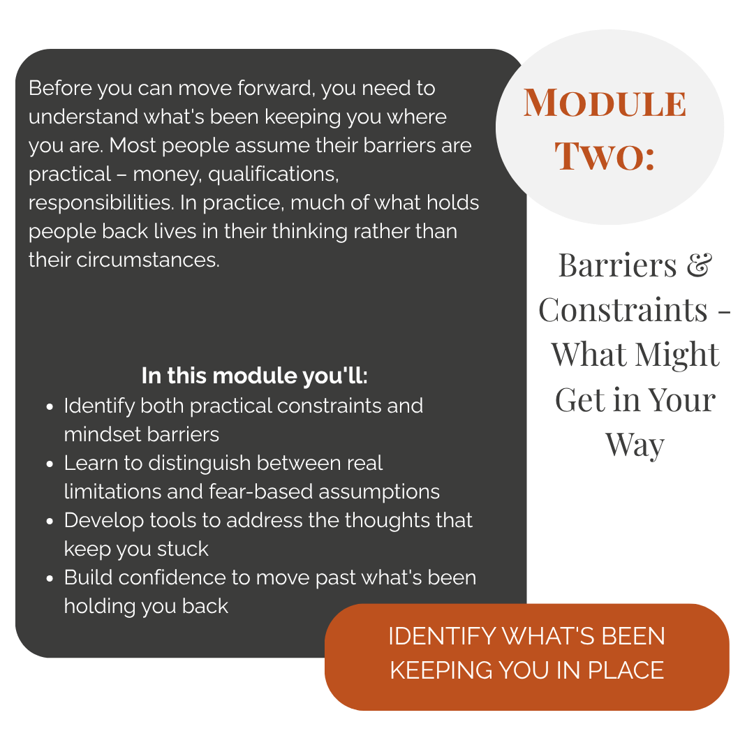 You're stuck because you haven't yet had the space to step back and look at the full picture – what you actually value now, what conditions you need to thrive, and what good looks like at this stage of your life.